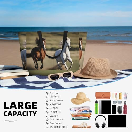 • Extra Large Capacity: The Running Horses Large Tote Bag Measures 15" X 17.7" X 6.7", Designed To Hold Everything You Need For A Day At The Beach, A Weekend Away Or A Long Term Travel, Such As Travel Essentials, Cosmetics, Sunscreen, Clothes, And More. The Inner Pocket Keeps Soggy Swimsuits, Towels And Toiletries Separate From Your Dry Belongings.