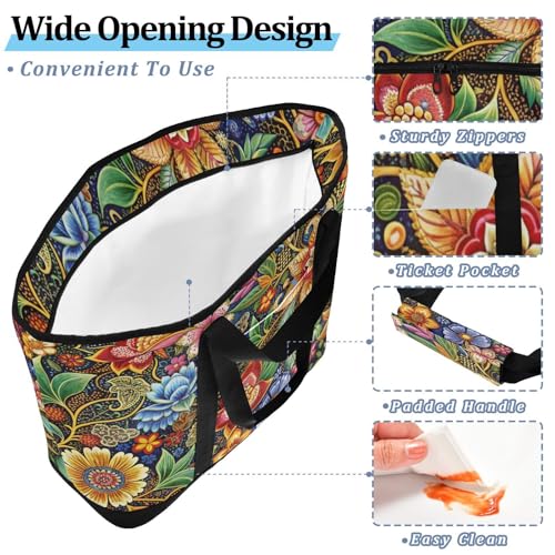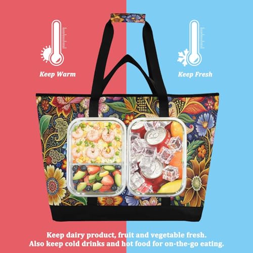HOT ! Indonesian Batik Flowers Large Insulated Tote Bag for Grocery Shopping Reusable Tote Bags for Women Men, Cooler Bag with Zippered Top & Handles for Beach Picnic Travel