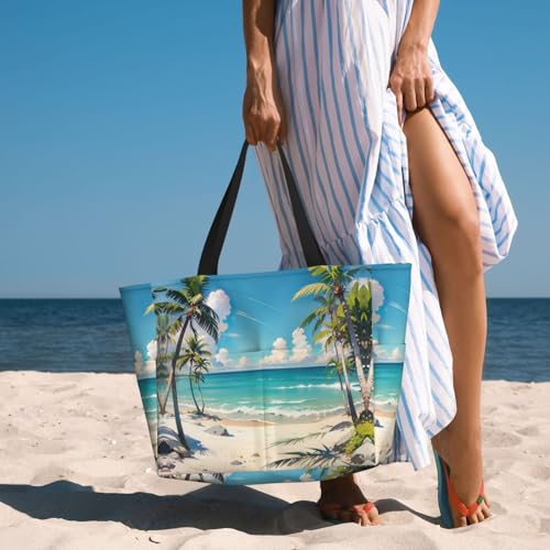 Beach Bag for Women, Waterproof Sandproof Beach Pool Travel Duffel Bags with 7 Pockets, Large Capacity Shoulder Tote Bag for Gym Travel Vacation Essential, Beach Coconut Tree Summer 2