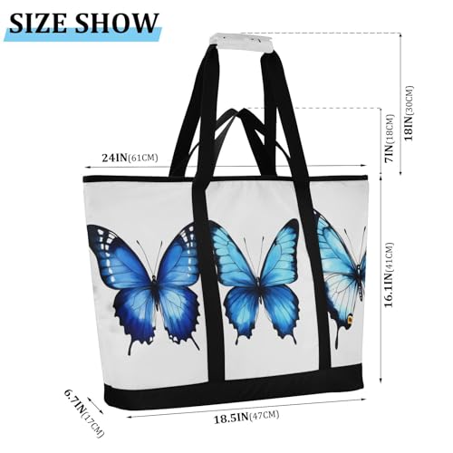 HOT ! Large Insulated Tote Bag Three Blue Butterflies for Grocery Shopping Reusable Tote Bags for Women Men, Cooler Bag with Zippered Top & Handles for Beach Picnic Travel