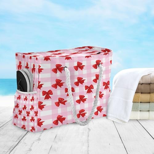 Red Bows Beach Bag with Top Zipper Closure, Waterproof Pool Bag, Large Beach Tote for Women#36 5