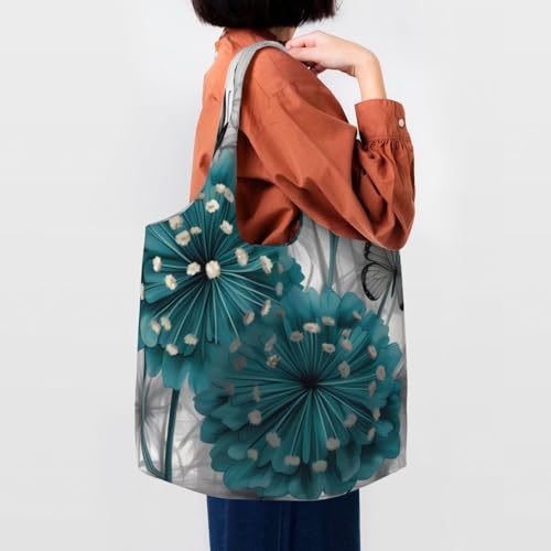 (Gray Teal Flower Butterfly) Large Tote Shoulder Bag Fashion Canvas Handbag Reusable Shopping Bag Travel Bag For Women 4