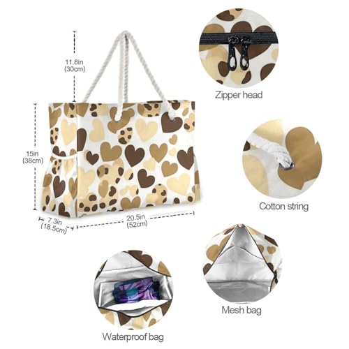 Brown Leopard Heart Sandproof Tote Carry On Luggage with side pocketes Weekender Overnight Bag with zippered pockets 6