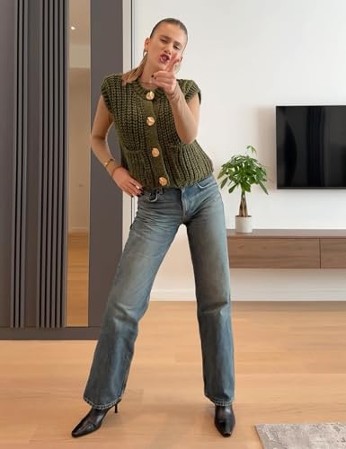 Flygo Womens Sleeveless Crop Chunky Knit Cardigan Trendy Button Down Cropped Knitted Sweater Vest Tops with Pockets 6