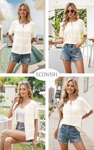 ECOWISH Summer Crochet Cardigans for Women: 2025 Lightweight Short Sleeve Crewneck Button Down Cropped Casual Sweater Tops 2