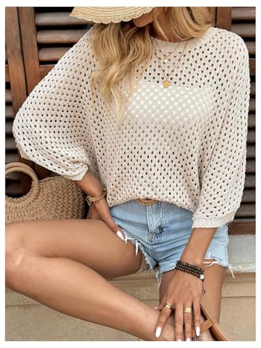 GORGLITTER Women's 3/4 Length Sleeve Crochet Tops Summer Hollow Out Pullover Knit Sweater 3