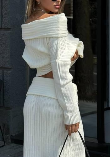 Unybwonn Skirt Sets Women 2 Piece Outfits off the Shoulder Sweater and Knitted Skinny Maxi Skirts Fall Casual Outfits 6
