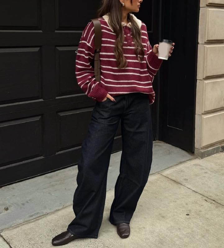 HOT ! Women Striped Knit Polo Shirt Long Sleeve Lapel Collar Pullover Sweater Y2K Color Block Oversized Rugby Sweatshirt