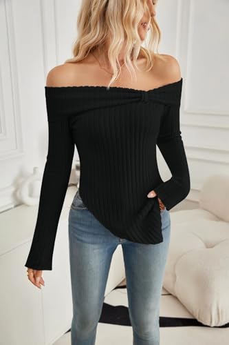 HOT ! Sumleno Womens Cute Bow Off Shoulder Knitted Sweater Shirt Tops Sexy Side Slit Pullover Trendy Y2k Aesthetic Clothes