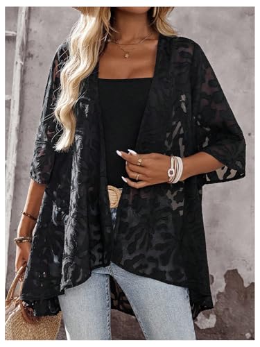 More information about OYOANGLE Women's Lace Sheer Open Front Cardigan 3/4 Sleeve Lightweight See Through Jacket