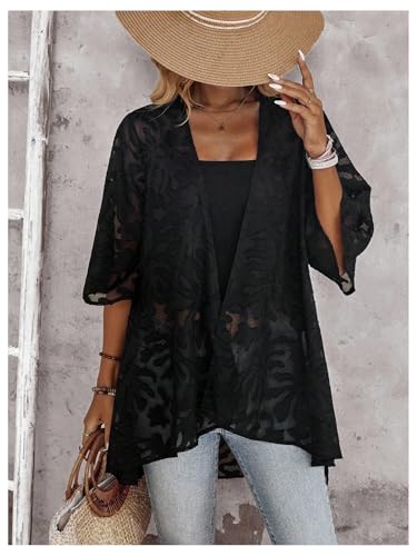 OYOANGLE Women's Lace Sheer Open Front Cardigan 3/4 Sleeve Lightweight See Through Jacket 1
