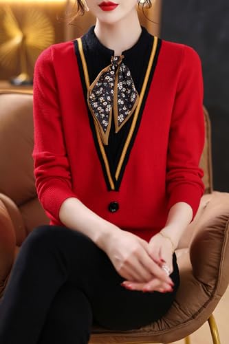 LAI MENG FIVE CATS Women's Fall Tie Neck Sweater Shirt Long Sleeve Patchwork Knit Pullover Blouse Tops 2