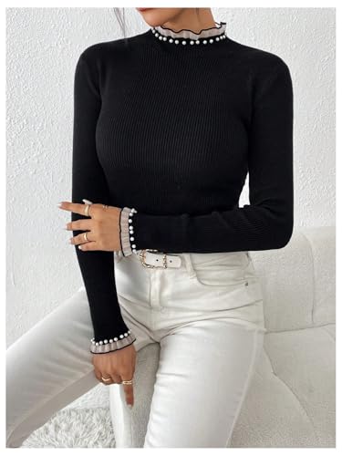 • Features: Slim fit pullover, designed with mock neck, frill trim, long sleeve, pearls, rib knit