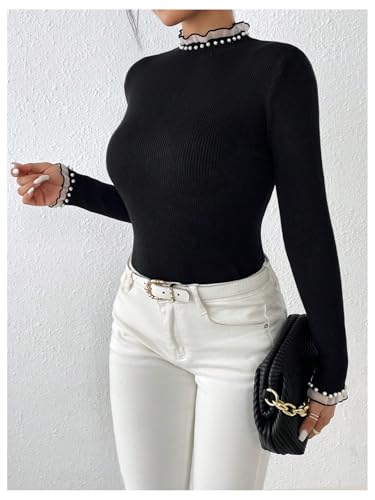 More information about WDIRARA Women's Pearls Mock Neck Frill Trim Long Sleeve Pullover Knitted Fit Top