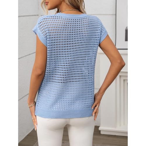 Blostirno Women's Crochet Knit Sweater Vest Hollow Out Crewneck Cap Short Sleeve Beach Cover Up Summer Shirt Tops 6