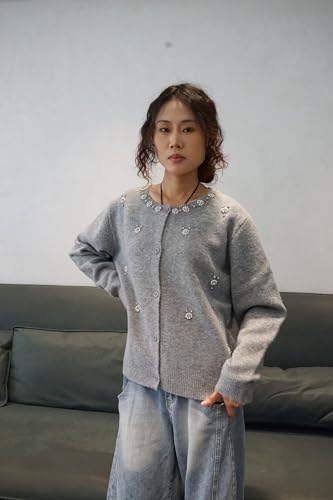 • ELEGANT DESIGN: Grey knit cardigan featuring delicate crystal flower embellishments and pearl details for a sophisticated look