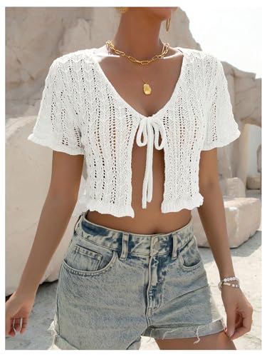 • Features: Cropped cardigan sweater for women, summer lightweight cardigan, v neck, front-tie closure, short sleeve, slim-fitted, solid color, hollow out, knit crop top