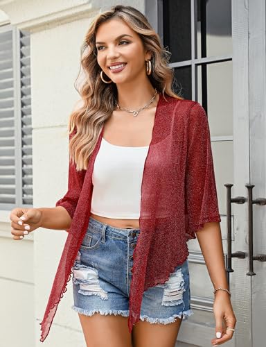 HOT ! Totatuit Womens Shiny Sheer 3/4 sleeve Shrug Tie Bolero Top Open Front Mesh Cardigan Lightweight Knit