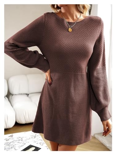 Women's Autumn Winter Lantern Sleeve Round Neck High-Waisted Sweater Dress Solid Color Elegant Knit Mini Skirt Jumper 6