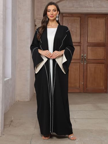 MedeShe Women's Loose Black Floral Beading Draped Open Kimono Abaya Cardigan Jalabiya 1