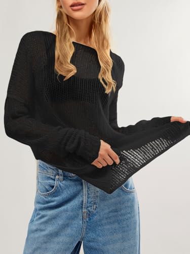 SuperPrity Womens Tops Long Sleeve Crochet Knit Top 2024 Hollow Out Side Split Swimsuit Cover Up Beach Vacation Outfit 5