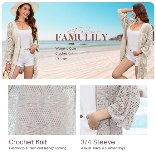 Famulily Womens Cute Crochet Knit Cardigan 3/4 Sleeve Hollow Out Open Front Cover Ups Tops 3