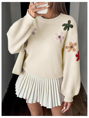 HOT ! GORGLITTER Women's Flower Embroidered Sweater Floral Lantern Sleeve Crewneck Knit Cute Sweaters Pullover