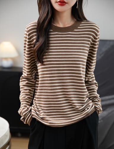 Women's Merino Wool Blend Sweater 2025 Fall Winter Casual Crew Neck Striped Long Sleeve Knit Pullover Sweater 2