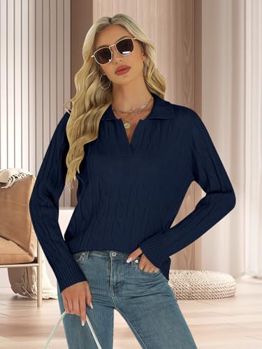More information about Womens Long Sleeve Sweaters Cable Tops Solid Lapel Polo V Neck Knit Casual Soft Pullover Shirt 2025 Spring Outfits Navy Blue