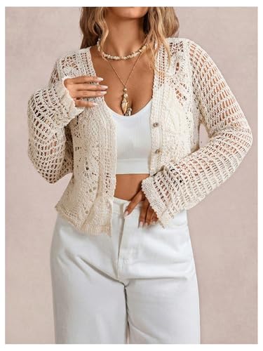 HOT ! MakeMeChic Women's Plus Size Crochet Sweater Cardigan Button Down Long Sleeve Lightweight Outerwear