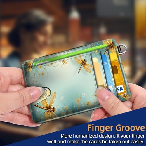 Slim RFID Blocking Wallet Minimalist Front Pocket Card Holder, Golden Dragonfly on Light Blue Secure Leather Credit Card Case with Security Pockets for Men and Women 4