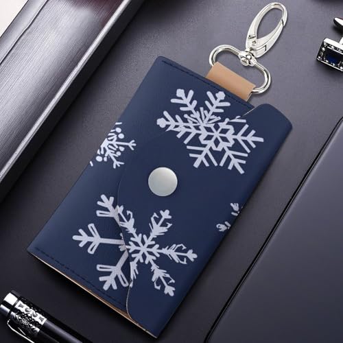 Snowflakes Simple Minimalistic Navy Blue Key Holder Bag PU Leather ID Card Holder Keychains Case Cover for Men Women 7