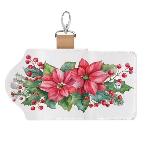Red Christmas Flowers Holly Pinecones Key Holder Bag PU Leather ID Card Holder Keychains Case Cover for Men Women 3