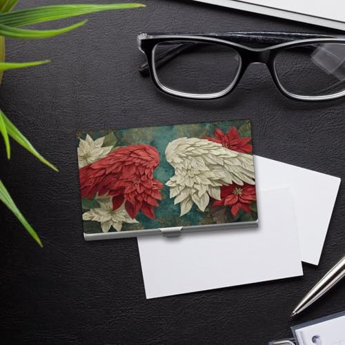 Red White Poinsettias Angel Wings Business Card Holder, Pocket Slim Portable Metal Business Card Case for Women Men 7