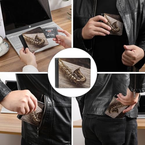 Men's Leather Wallet Bifold Wallet for Men Saxophone on Sheet Music Slim Wallet with Multiple Card Classic Passcase Mens Card Holder 4