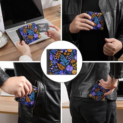 HOT ! Abstract Floral Motif Blue Leaves Soft PU Leather Bifold Wallet, Coin Purse Credit Pass Case, Durable Card-Holder Slim Billfold for Men Woman Money Storage