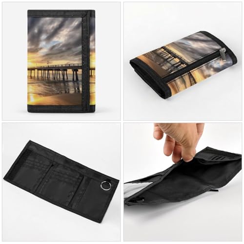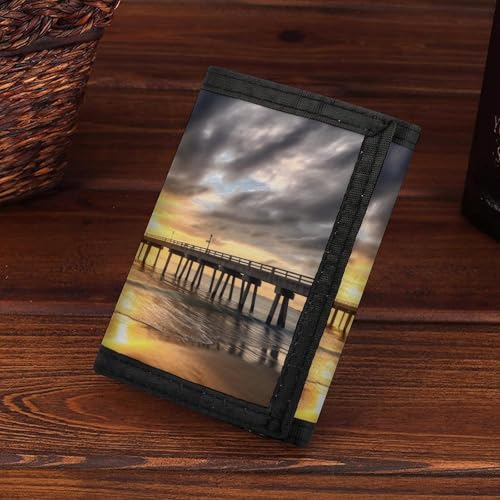 HOT ! Beach Sea Bridge Clouds Sunset Print Trifold Wallet with ID Window & Key Ring | Slim Front Pocket Wallet with 8 Card Holder
