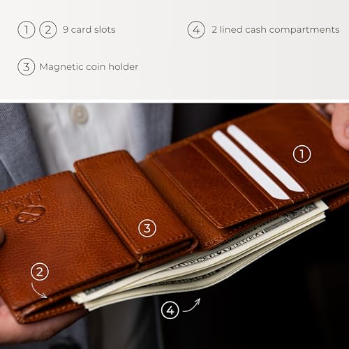 • ✔️ THOUGHTFUL INTERIOR lined with textile and leather not only adds a touch of modern luxury but also ensures practicality, with nine credit card slots, two cash compartments, and a magnetic coin holder, keeping your essentials secure and organized.