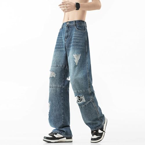 More information about Men’s Ripped Patchwork Jeans Baggy Straight Leg Denim Pants Horizontal Distressed Panels Washed Vintage Look