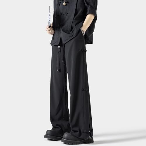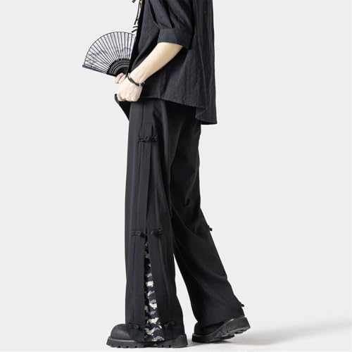 HOT ! Seidarise Men's Chinese - Style Black Wide Leg Pants Knot Details Patterned Side Slits Ideal for Cultural Casual Looks