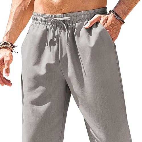 HOT ! Men's Linen Pants Drawstring Elastic Waist Baggy Summer Pants Casual Loose Fit Beach Trousers with Pockets