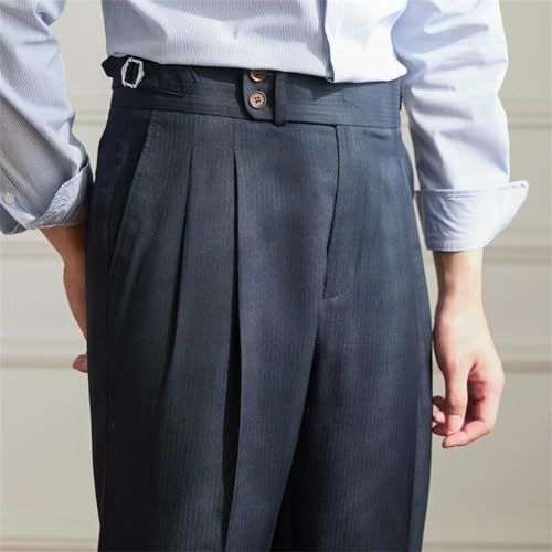 HOT ! Men's Thin Retro Striped High Waist Pants Italian Style Breathable Wool Blend Straight Leg Casual Work Trousers
