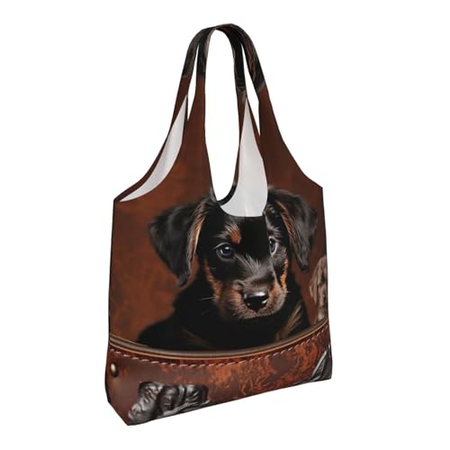 • MULTIPURPOSE - These reusable shopping totes bag can be used as grocery shopping bag, gift bag, canvas craft bag, library bag, vacation bag, beach bag, Puppy sitting on brown leather crate shopping bag and more, also can be used as DIY art crafts for women