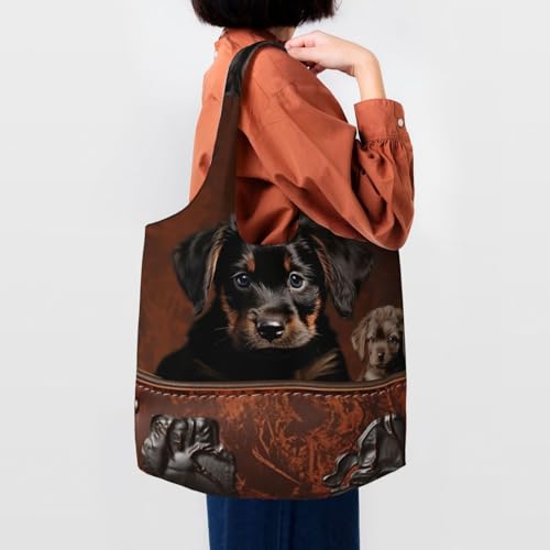 • PORTABLE - It's easy to fold this Puppy sitting on brown leather crate shoulder grocery bags, put it in your pocket and carry it everywhere, save your space and free your hands. Hand wash or gentle machine wash is recommended, do not bleach
