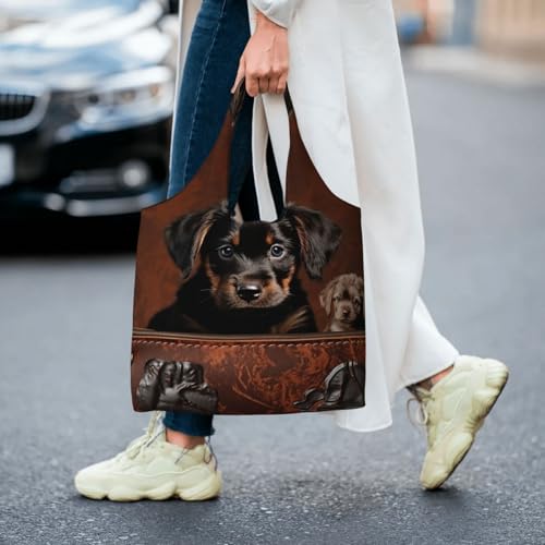 • STRONG AND DURABLE - Our canvas cloth grocery tote bag is made of canvas, lock stitching inside for maximum strength allowing the Puppy sitting on brown leather crate tote bag to hold up extra bearing capacity, sturdy enough for all kinds of daily use