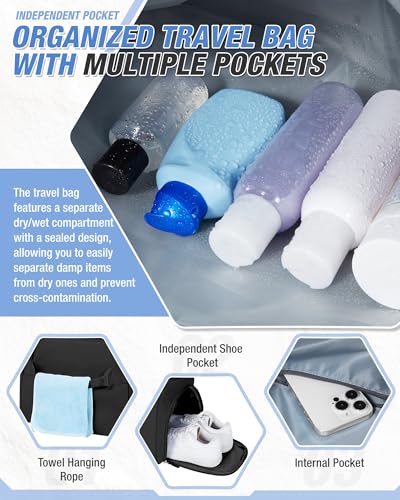 • 💺Designed for Every Journey - This travel duffel bag is designed for efficiency, featuring a separate waterproof compartment for wet gear, a dedicated shoe compartment, side zippered pockets for quick access, and an external towel loop for keeping essentials within easy reach.