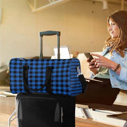HOT ! Blue Buffalo Plaid Travel Duffle Bag, Weekender Bags for Women Men, Carry on Overnight Bag Waterproof Gym Bags, Hospital Bag for Labor and Delivery