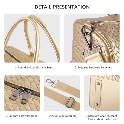 Woven Leather Travel Duffel Bag with Shoe Compartment, Carry On Garment Bag for Men Women, Large Capacity Water-resistant Weekender Tote (Gold) 4