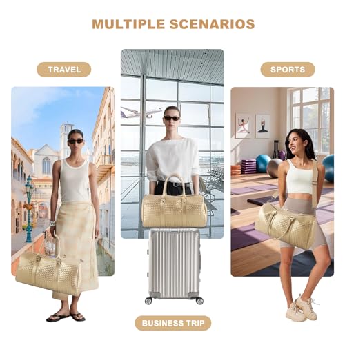 HOT ! Woven Leather Travel Duffel Bag with Shoe Compartment, Carry On Garment Bag for Men Women, Large Capacity Water-resistant Weekender Tote (Gold)