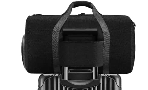 • Extras Bonus: 1.) Side shoe pocket with 2 ventilated air vents. 2.) The sleeve on the back of the duffle has an additional adhesion belt to keep the bag stayed on the suitcase tightly. 3.) It comes with rounded stitched grip handles and padded, adjustable, removable shoulder strap buckle